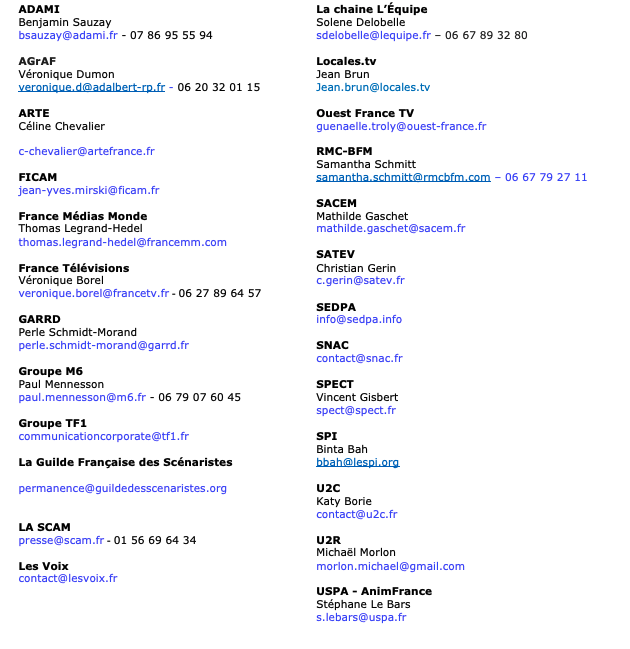 ![]() A l’occasion du Festival de la Fiction de La Rochelle, les membres de La Filière Audiovisuelle réaffirment unanimement la nécessité de préserver un financement pérenne de l’audiovisuel public. Les premiers projets budgétaires du gouvernement semblent indiquer une baisse sensible de la dotation publique de France Télévisions correspondant à plus de 65 millions d’euros d’économies. De façon inédite, il semblerait que ces économies pourraient être faites sur les investissements du groupe public dans la création et sur les magazines, jeux et divertissements dont les budgets ont déjà baissé de 5% en 2025. Or, comme le démontre le Livre blanc de La Filière Audiovisuelle publié avant l’été, cette enveloppe contribue de manière essentielle et directe au dynamisme du secteur et à la création de valeur nationale. Toute réduction du budget des programmes aurait des répercussions immédiates sur l’emploi et la production audiovisuelle. La Filière Audiovisuelle, représentante des différents maillons de la filière, en appelle donc au nouveau Premier ministre afin qu’a minima, il sanctuarise les 440 millions d’euros investis dans la création audiovisuelle. Par ailleurs, les tensions sur les ressources publicitaires des chaînes privées en clair rappellent l’urgence de mener des réformes structurelles afin de garantir la viabilité économique des acteurs privés et la pérennité de leurs investissements dans la création. Dans un contexte de transformation numérique accélérée et de concurrence internationale renforcée, ce document stratégique identifie les leviers essentiels pour un audiovisuel français résilient et innovant. À propos de LaFA La Filière Audiovisuelle (LaFA) a été créée en novembre 2024 à l’initiative de plusieurs éditeurs, syndicats d’auteurs et producteurs. Elle réunit 23 membres, dans une démarche inédite et unique au monde, pour construire et diffuser largement une compréhension commune des enjeux du secteur audiovisuel français. Son ambition est d’accompagner la transformation du secteur, de garantir la diversité et le renouvellement de la création et d’assurer le rayonnement de l’exception culturelle française. Contacts Presse ADAMI AGrAF ARTE FICAM France Médias Monde France Télévisions Véronique Borel GARRD Groupe M6 Groupe TF1 La Guilde Française des Scénaristes LA SCAM Les Voix L’EquipeTV Locales.tv SACD SACEM SATEV SEDPA SNAC SPECT SPI U2C U2R USPA – AnimFrance ![]() | A l’occasion du Festival de la Fiction de La Rochelle, les membres de La Filière Audiovisuelle réaffirment unanimement la nécessité de préserver un financement pérenne de l’audiovisuel public. Les premiers projets budgétaires du gouvernement semblent indiquer une baisse sensible de la dotation publique de France Télévisions correspondant à plus de 65 millions d’euros d’économies. De façon inédite, il semblerait que ces économies pourraient être faites sur les investissements du groupe public dans la création et sur les magazines, jeux et divertissements dont les budgets ont déjà baissé de 5% en 2025. Or, comme le démontre le Livre blanc de La Filière Audiovisuelle publié avant l’été, cette enveloppe contribue de manière essentielle et directe au dynamisme du secteur et à la création de valeur nationale. Toute réduction du budget des programmes aurait des répercussions immédiates sur l’emploi et la production audiovisuelle. La Filière Audiovisuelle, représentante des différents maillons de la filière, en appelle donc au nouveau Premier ministre afin qu’a minima, il sanctuarise les 440 millions d’euros investis dans la création audiovisuelle. Par ailleurs, les tensions sur les ressources publicitaires des chaînes privées en clair rappellent l’urgence de mener des réformes structurelles afin de garantir la viabilité économique des acteurs privés et la pérennité de leurs investissements dans la création. Dans un contexte de transformation numérique accélérée et de concurrence internationale renforcée, ce document stratégique identifie les leviers essentiels pour un audiovisuel français résilient et innovant. À propos de LaFA La Filière Audiovisuelle (LaFA) a été créée en novembre 2024 à l’initiative de plusieurs éditeurs, syndicats d’auteurs et producteurs. Elle réunit 23 membres, dans une démarche inédite et unique au monde, pour construire et diffuser largement une compréhension commune des enjeux du secteur audiovisuel français. Son ambition est d’accompagner la transformation du secteur, de garantir la diversité et le renouvellement de la création et d’assurer le rayonnement de l’exception culturelle française. Contacts Presse ADAMIBenjamin Sauzay bsauzay@adami.fr – 07 86 95 55 94 AGrAFVéronique Dumon veronique.d@adalbert-rp.fr – 06 20 32 01 15 ARTECéline Chevalier c-chevalier@artefrance.fr FICAMjean-yves.mirski@ficam.fr France Médias MondeCorentin Lepagecorentin.lepage@rfi.fr France Télévisions Véronique Borelveronique.borel@francetv.fr – 06 27 89 64 57 GARRDPerle Schmidt-Morandperle.schmidt-morand@garrd.fr Groupe M6Paul Mennessonpaul.mennesson@m6.fr – 06 79 07 60 45 Groupe TF1communicationcorporate@tf1.fr La Guilde Française des Scénaristespermanence@guildedesscenaristes.org LA SCAMpresse@scam.fr – 01 56 69 64 34 Les Voixcontact@lesvoix.fr L’EquipeTVSolene Delobellesdelobelle@lequipe.fr – 06 67 89 32 80 Locales.tvJean BrunJean.brun@locales.tv SACDChloé Rayneauchloe.rayneau@sacd.fr SACEMMathilde Gaschetmathilde.gaschet@sacem.fr SATEVChristian Gerinc.gerin@satev.fr SEDPAinfo@sedpa.info SNACcontact@snac.fr SPECTVincent Gisbertspect@spect.fr SPIEmmanuelle Maugeremauger@lespi.org U2Ccontact@u2c.fr U2RMichaël Morlonmorlon.michael@gmail.com USPA – AnimFranceStéphane Le … | 24 septembre 2025 | Actus-Adhérents, Actus-SPI | actus-adherents actus-spi | |||||||||||||||||||||||||||||||||||||||||